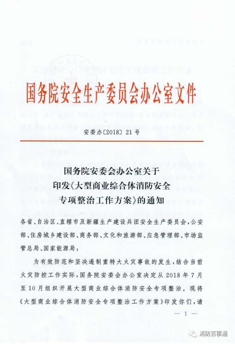 近年來(lái),我國(guó)大型商業(yè)綜合體逐年增多。這類(lèi)場(chǎng)所一旦發(fā)生火災(zāi),損失大、傷亡大、影響大,滅火救援困難。為切實(shí)加強(qiáng)火災(zāi)防控工作,充分保障人民群眾生命財(cái)產(chǎn)安全,國(guó)務(wù)院安委會(huì)辦公室決定在全國(guó)范圍內(nèi)組織開(kāi)展大型商業(yè)綜合體消防安全專(zhuān)項(xiàng)整治。特制定工作方案如下: