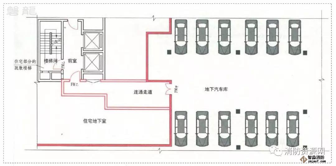1、與住宅地下室相連通的地下汽車庫、半地下汽車庫,人員疏散可借用住宅部分的疏散樓梯(圖示2);當不能直接進入住宅部分的疏散樓梯間時,應在汽車庫與住宅部分的疏散樓梯之間設置連通走道,走道應采用防火隔墻分隔,汽車庫開向該走道的門均應采用甲級防火門(圖示3)。(6.0.7)