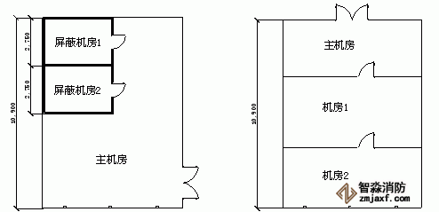 如上圖所述,兩個屏蔽機房被套裝在主機房內(nèi)。滅火分區(qū)劃分出現(xiàn)兩種不同意見,一種意見是將三個房間劃成一個區(qū)域采用全淹沒單元獨立系統(tǒng)進行滅火,也就是說三個區(qū)域中任何一個發(fā)生火災時三個房間同時發(fā)出警報并同時噴放藥劑;另外一種意見是將這三個房間當成三個獨立的防火分區(qū),采用一套組合分配全淹沒滅火系統(tǒng),任何一個房間發(fā)生火災時三個房間同時報警,但系統(tǒng)只向發(fā)生火災的區(qū)域噴放滅火藥劑。前者意見使用藥劑量要大于后者,三個房間實際被當作一個獨立的滅火區(qū)對待,基本無太多異議,但投資相對后者要高;后者情況需要我們模擬火災現(xiàn)場后再定,若機房1著火,全部房間報警,人員全部撤離,藥劑只輸送到機房1,若主機房發(fā)生火災,全部房間報警,人員全部撤離,藥劑只輸送到主機房,基本無任何危險情況發(fā)生,警報區(qū)域和范圍依照《火災自動報警系統(tǒng)設計規(guī)范》4.2.1.1化為一個報警區(qū)域,滅火區(qū)域劃分為三個獨立的保護區(qū),并按照氣體保護區(qū)要求設置外開門及圍護結(jié)構(gòu)。所以后者方案從使用和投資方面講更合理。