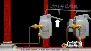 1、 確認(rèn)發(fā)生火災(zāi)的防護(hù)區(qū),找到防護(hù)區(qū)對(duì)應(yīng)的選擇閥,手動(dòng)打開選擇閥;