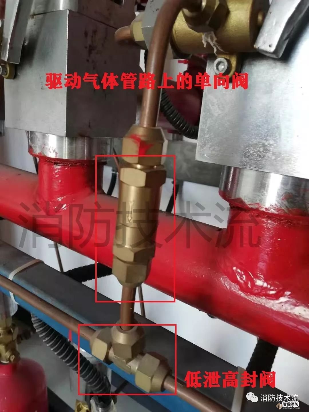 圖七:驅(qū)動(dòng)氣體管路上的單向閥及低泄高封閥(安裝在系統(tǒng)啟動(dòng)管路上,正常情況下處于開(kāi)啟狀態(tài)。用來(lái)排除由于氣源泄漏積聚在啟動(dòng)管路內(nèi)的氣體,只有進(jìn)口壓力達(dá)到設(shè)定壓力時(shí)才關(guān)閉的閥門)