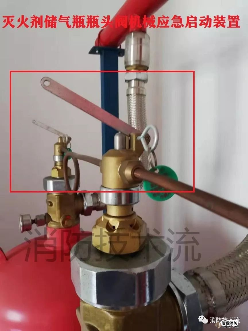 圖二:滅火劑儲(chǔ)氣瓶瓶頭閥的機(jī)械應(yīng)急啟動(dòng)裝置,當(dāng)自動(dòng)啟動(dòng)失效時(shí),拔掉保險(xiǎn)銷,壓下手柄開(kāi)啟瓶頭閥釋放滅火劑(此操作前需打開(kāi)對(duì)應(yīng)氣體防護(hù)區(qū)的選擇閥)