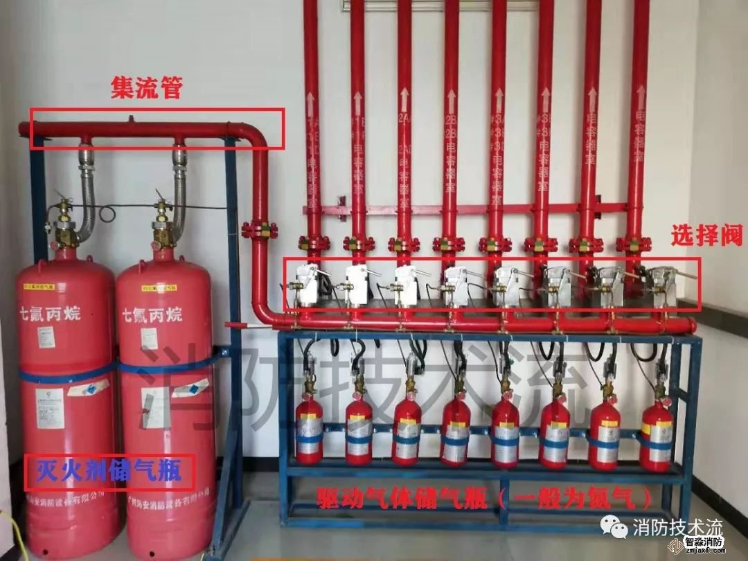 內(nèi)貯壓式氣體滅火系統(tǒng)一般由滅火劑瓶組、驅(qū)動(dòng)氣體瓶組、單向閥、選擇閥(適用于組合分配系統(tǒng))、驅(qū)動(dòng)裝置、集流管、高壓軟管、噴嘴、信號(hào)反饋裝置(壓力開(kāi)關(guān))、安全泄壓裝置、控制盤(pán)、低泄高封閥(適用于具有驅(qū)動(dòng)氣體瓶組的系統(tǒng))、管路管件等部件構(gòu)成。