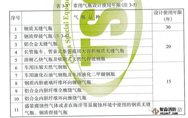 根據(jù)規(guī)程中表3-5,氣體滅火系統(tǒng)的儲(chǔ)氣瓶有無(wú)縫鋼瓶和焊接鋼瓶,使用年限分別為30年和20年,而這些數(shù)據(jù)根據(jù)該規(guī)程要求在出廠時(shí)應(yīng)作為永久性標(biāo)志刻在鋼瓶瓶身,仔細(xì)觀察,可以在瓶身上看到氣瓶的設(shè)計(jì)使用年限。